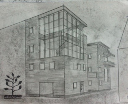 Creëerde ik een ontwerp dat in bouwstijl paste bij de vorige en aangrenzende atelierwoningen . Deze woning is op het noorden georiënteerd met veel glas in de gevel van af de tweede verdieping. Ik was geïnspireerd door een atelierwoning op de Montmartre.