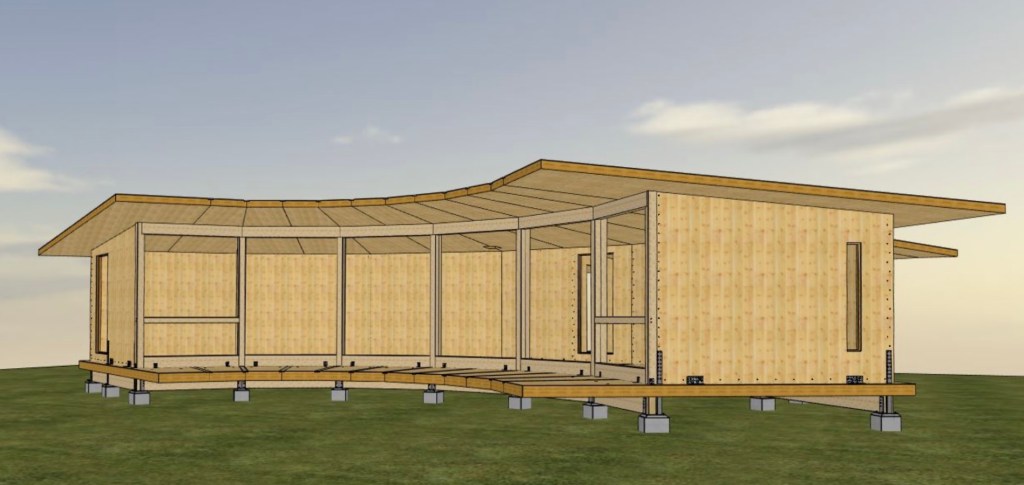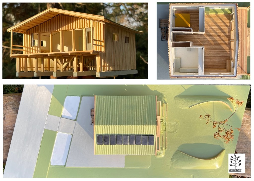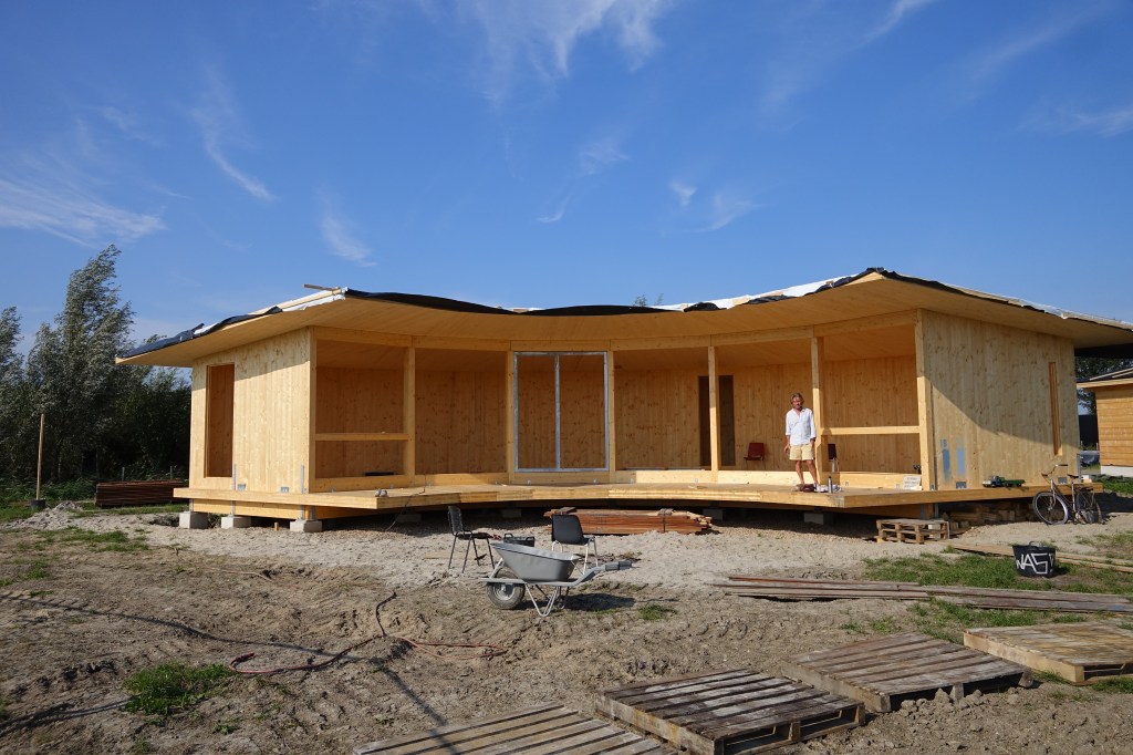 Dit ontwerp refereert aan een klassiek beeld van een houten woning op palen. De constructie bestaat uit Gluwlam houtscelet maatwerk onderdelen met traditionele schoren en korbelen onder de vloer en met magnesiumoxide platen boven de vloer voor de stabiliteit van het gebouw. De grote overstek en het terras is op het oosten georiënteerd wat resulteert in het van af de ochtend binnen laten van de winterzon. De woning staat op 1,5 meter palen voor overdekte buitenruimte onder de woning en voor het volledig kunnen bouwen in hout los van de ondergrond.