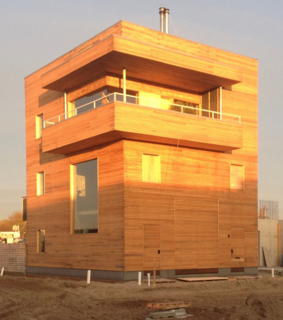 Met CLT cross laminated timber als bouwmateriaal creëerde ik een ontwerp dat vroeger met beton mogelijk was. Het ontwerp ontstond mede door opgeslagen beelden uit mijn reizende bestaan langs Scandinavische jachtclubs – een overdekt terras op het zuiden met uitzicht, en kloosters – besloten met licht gevulde hoge ruimte op de begane grond .