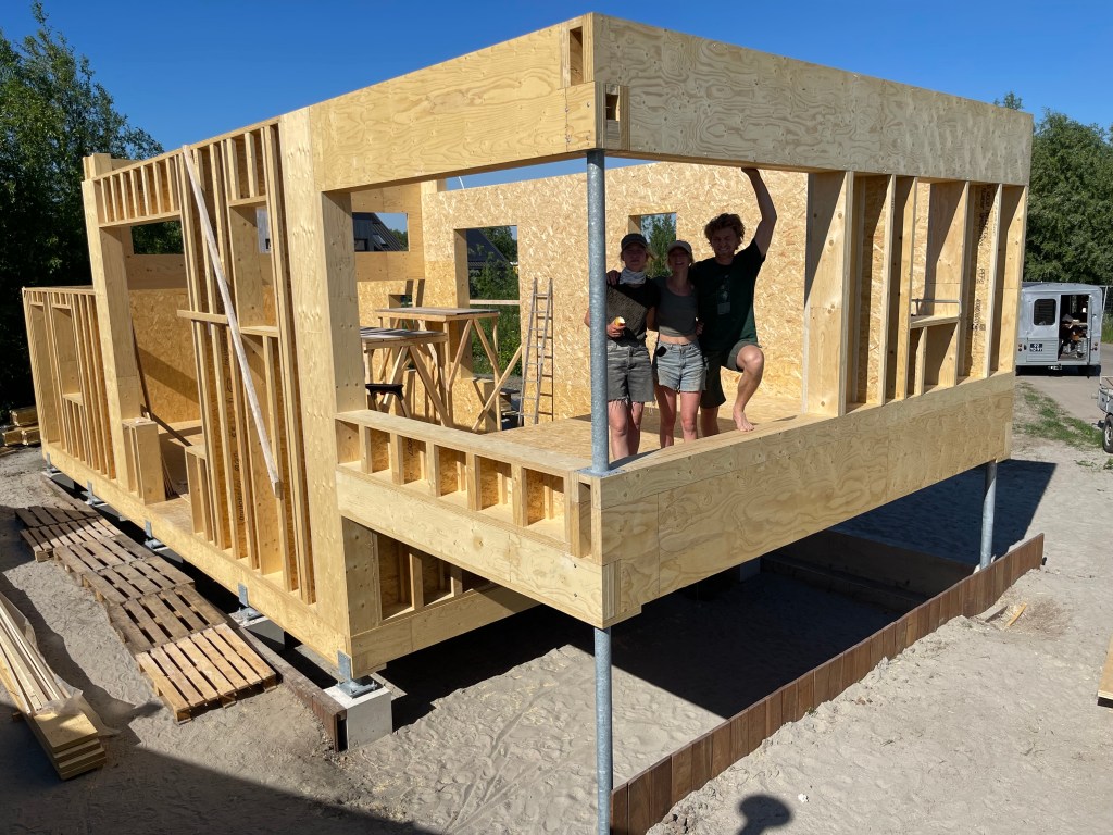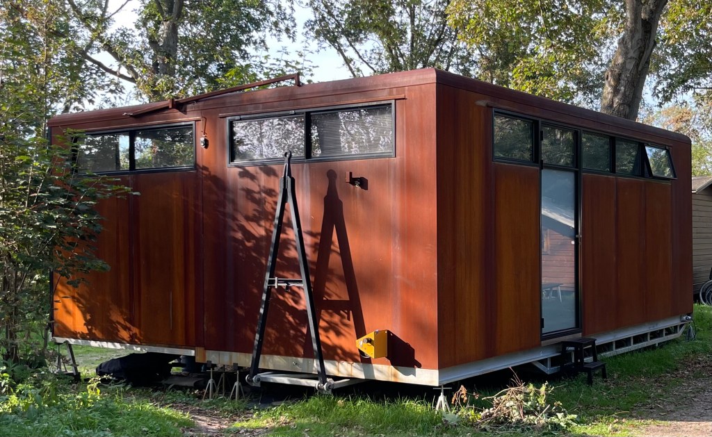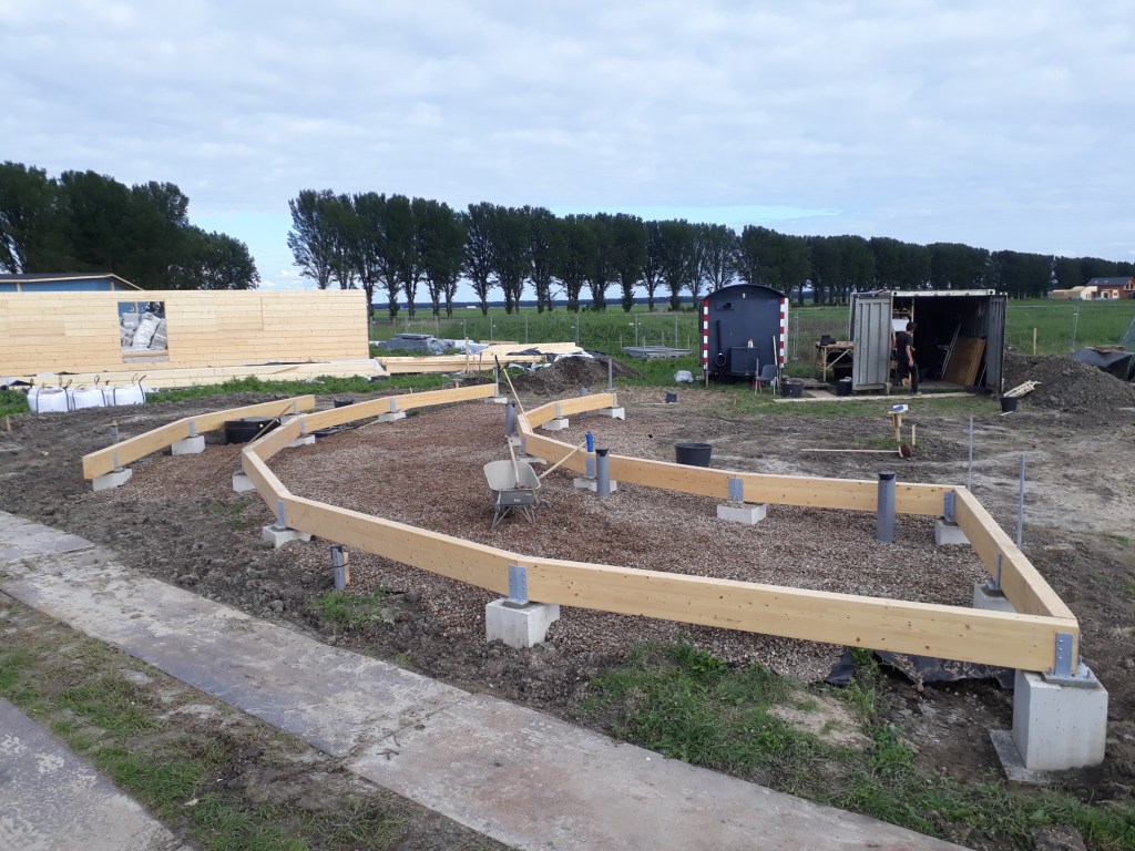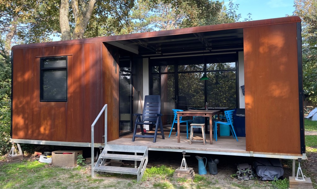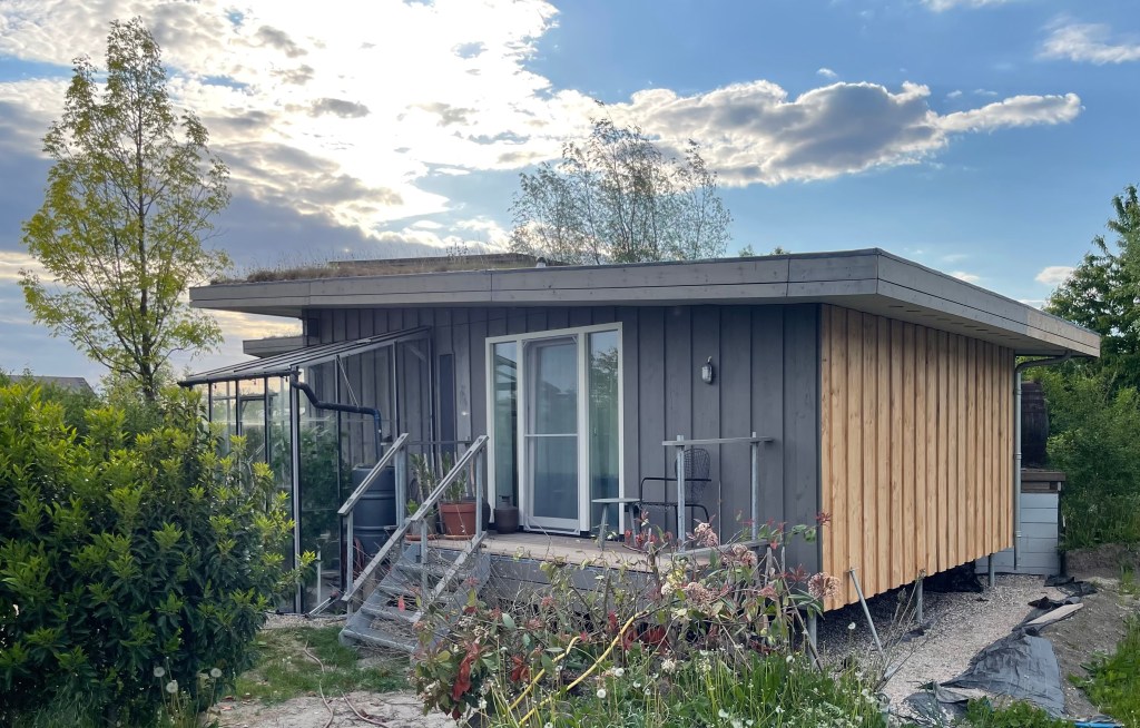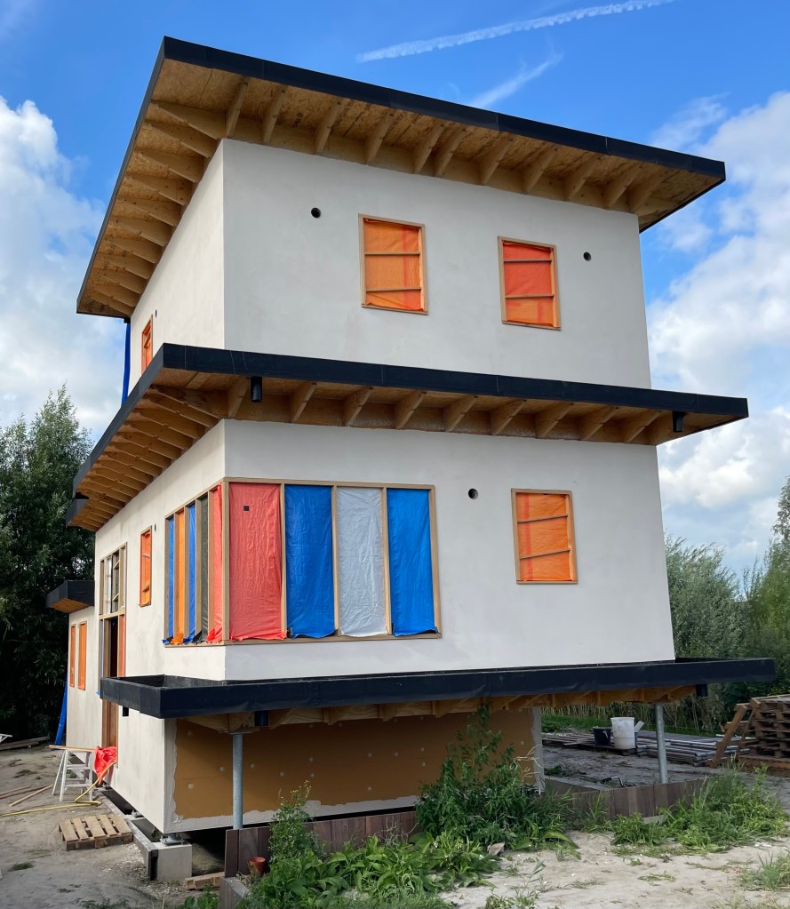 De woning staat 60 cm boven het maaiveld op 12 stalen voeten.