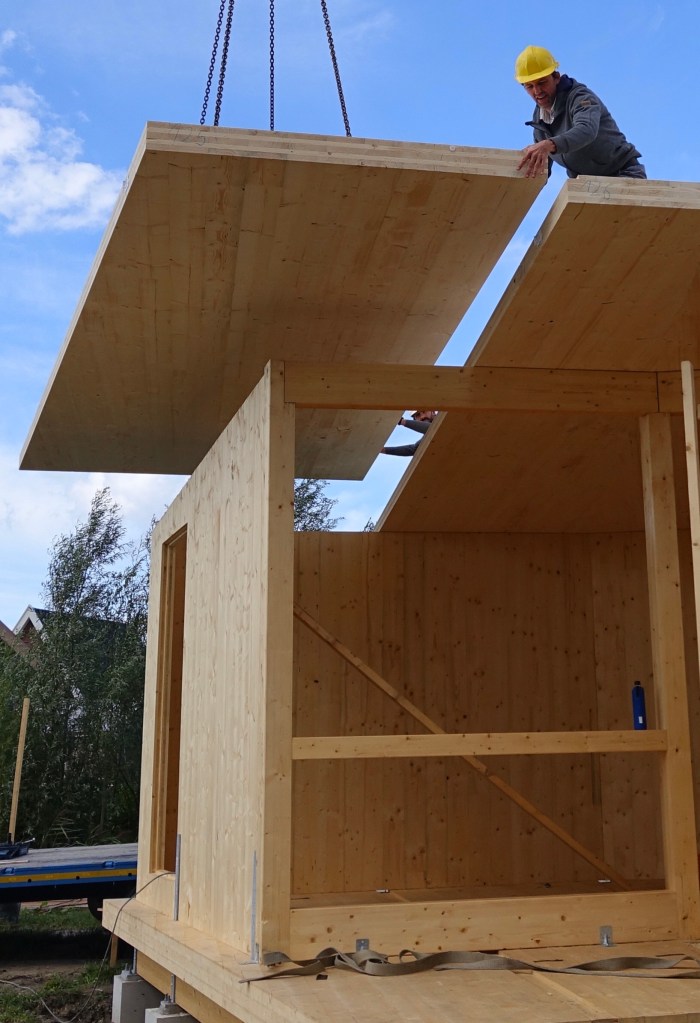 Met CLT cross laminated timber in combinatie met Glulam langs gelamineerd vurenhout als bouwmateriaal.